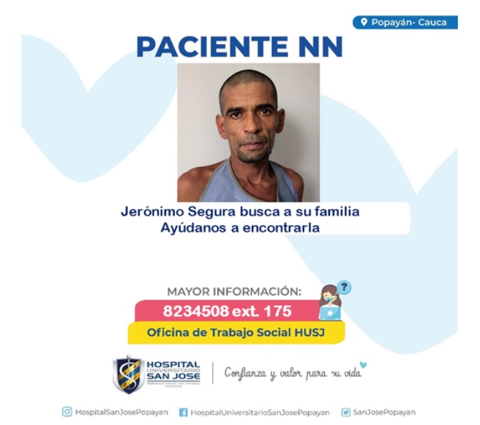 #ServicioSocial| Publicamos la imagen de Jerónimo Segura, actualmente se encuentra en la Unidad de Cuidado Intermedio y está buscando a su familia, el cree que se encuentra en Cali. Jerónimo...