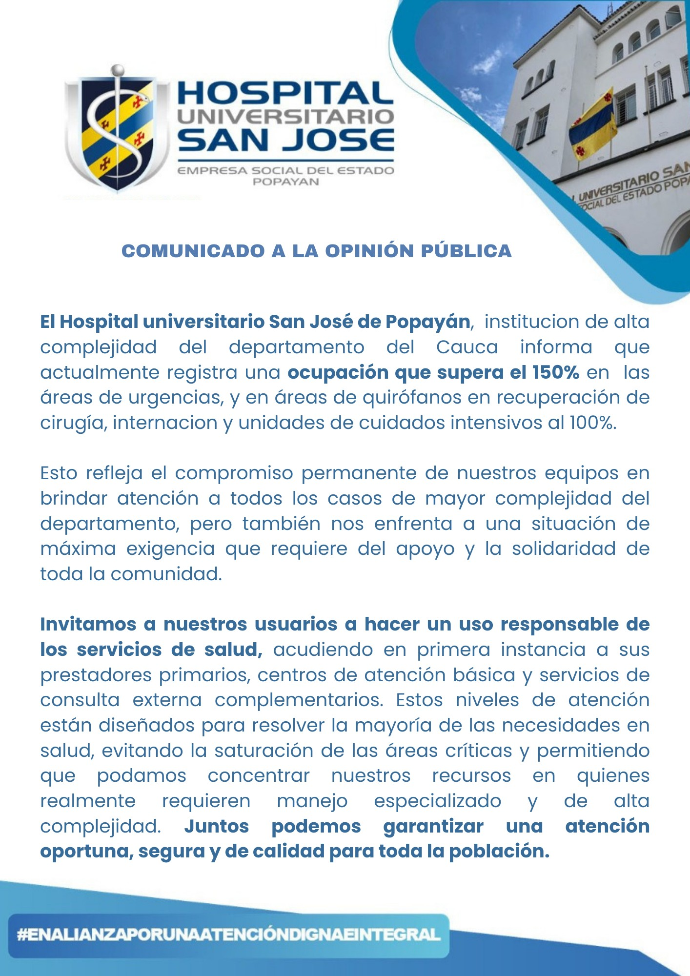 *El Hospital San José de Popayán está haciendo su parte, ahora nos toca a nosotros hacer la nuestra*.