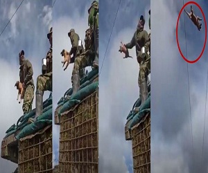En un video de 14 segundos que se viralizó en redes sociales, se observa a un grupo de soldados sobre una estructura tipo trinchera, desde allí uno de los uniformados alza un perrito y luego lo lanzan a varios metros del lugar, hasta que se estrella de manera violenta contra el piso.