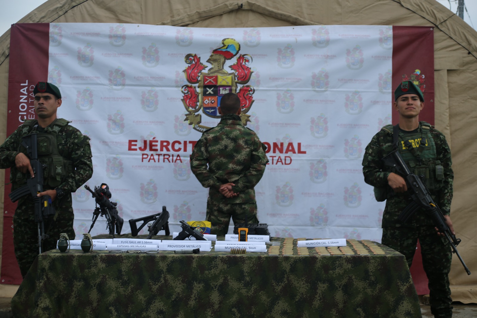 Este individuo entregó dos fusiles de largo alcance, un arma corta con sus respectivos proveedores y cartuchos; dos granadas de mano y material de comunicaciones, que quedaron a disposición de las autoridades competentes.